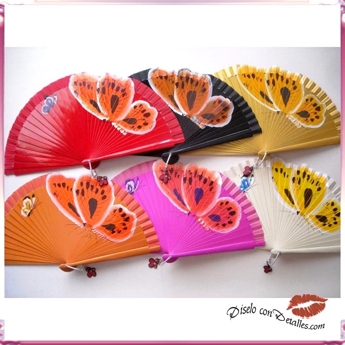 Abanicos de madera lacada en distintos colores con diseño de mariposas pintadas a mano por las dos caras. Se sirven en colores surtidos. Abanicos hechos artesanalmente en España.