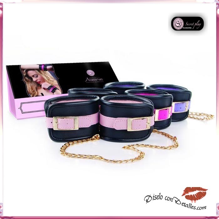 Esposas compuestas 100% de cuero de bovino con cadena y apliques de ZAMAK-5. Los colores están realizados con un baño de tinta sobre el cuero natural.