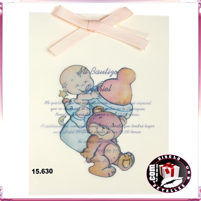 Invitación bautizo de niño o niña realizado en doble papel con el dibujo de un bebe con un osito de peluche y un biberón.