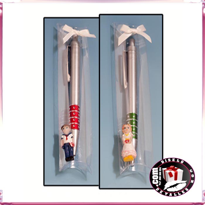 Bolígrafos surtidos de colores con figura de comunión de niño o niña realizada en resina en caja de acetato