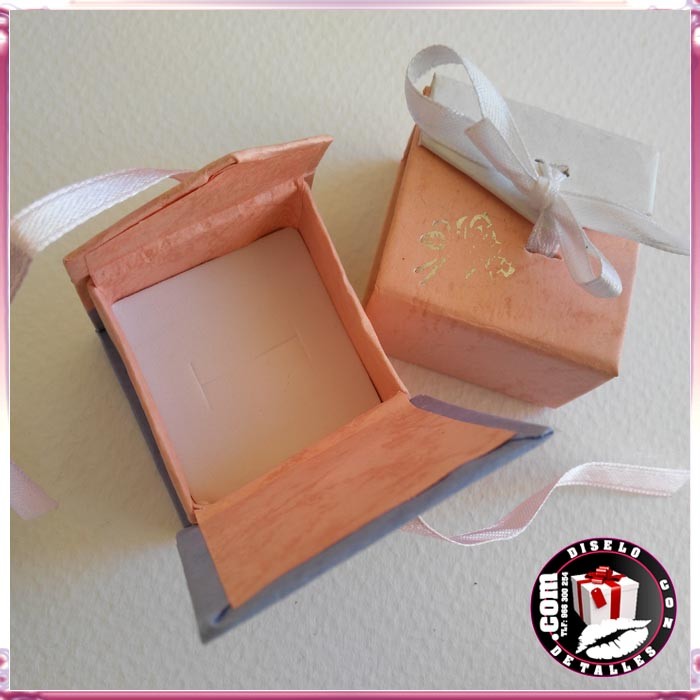 Caja de cartón con esponja en su interior para la presentación de anillos, pendientes, también para llaveros o pequeños detalles. Tapa de cartón, cierre con lazo y em colores surtidos.