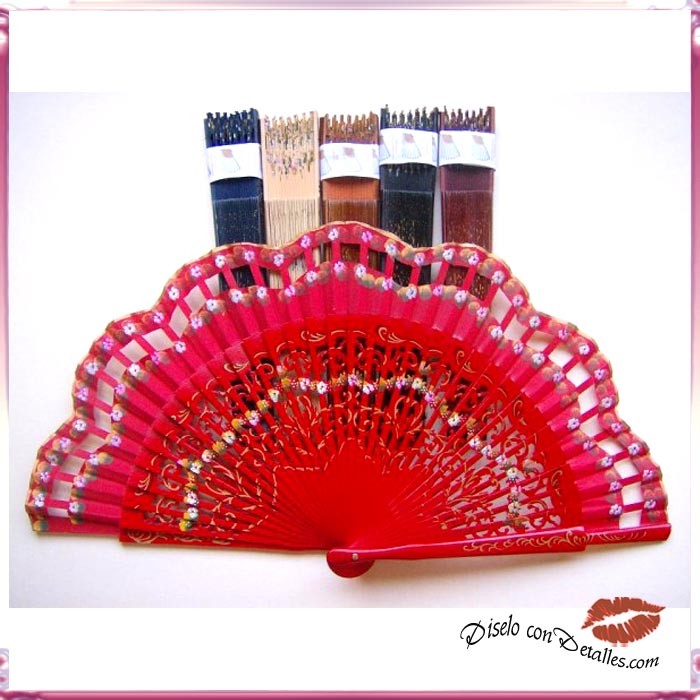 Leques para de madeira com flores pintadas à mão pelas duas caras e desing muito original. São servidos em 6 cores sortidas. Leques feitos à mão em Espanha.