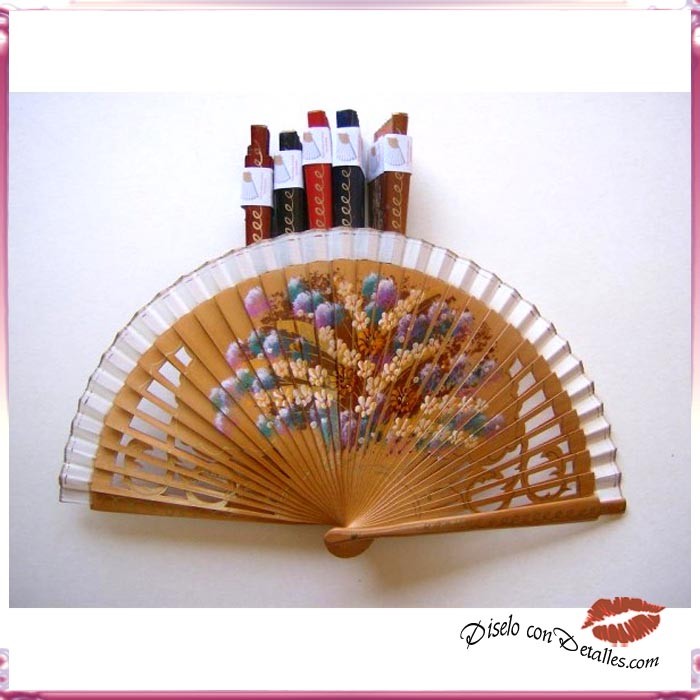 Leques de madeira entalhada com flores pintadas a mão pelas duas caras. São servidos em 6 cores sortidas. Leques feitos à mão em Espanha.