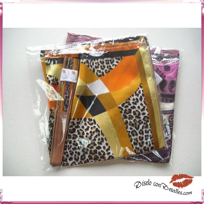 Leques de madeira de pereira polido com bello design feitos com tecido tacto de seda a condizer com o lenço. São servidos em modelos sortidos. Leques feitos à mão em Espanha.