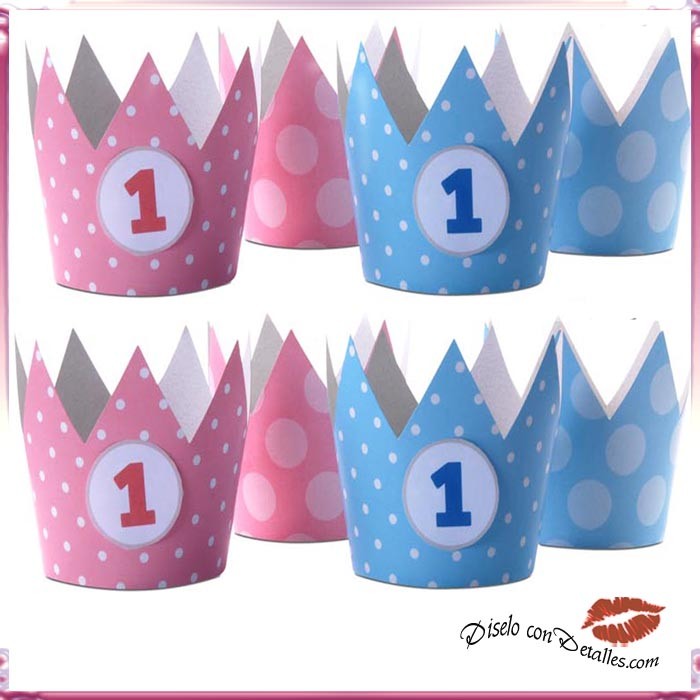 Coroas de festa para comemorar o primeiro ano em duas cores para escolher. Vem em pacotes de 4 uds.