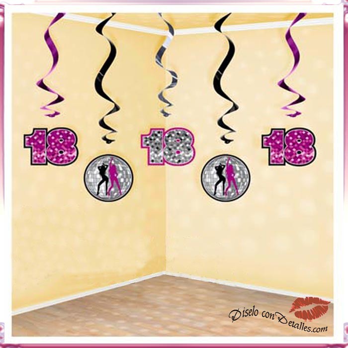Divertidas e alegres decorações penduradas para festas de aniversários, festas de anos com o número 18 anos a festejar. Vem em pacotes de 5 uds.