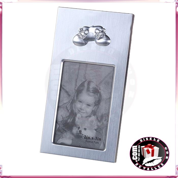 Bonitas molduras metálicas para dar a seus convidados. Molduras de fotos prata com motivos infantis em relevo de uns sapatos de bebê.