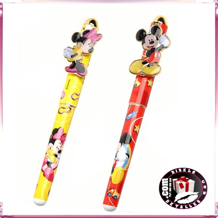 Canetas infantis de Mickey ou Minnie Mouse com chapa metálica na tampa.