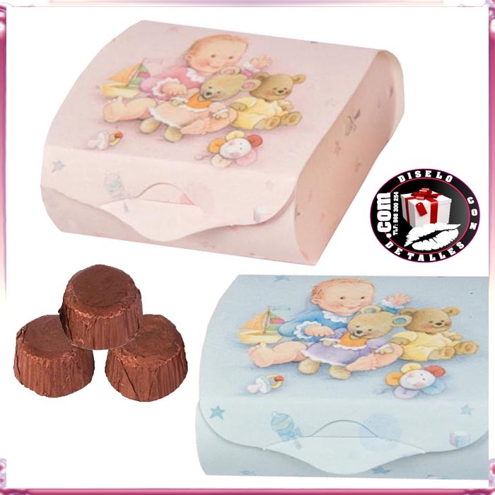 Caixas de batizado em duas cores para escolher e preenchido com 3 deliciosos chocolates.