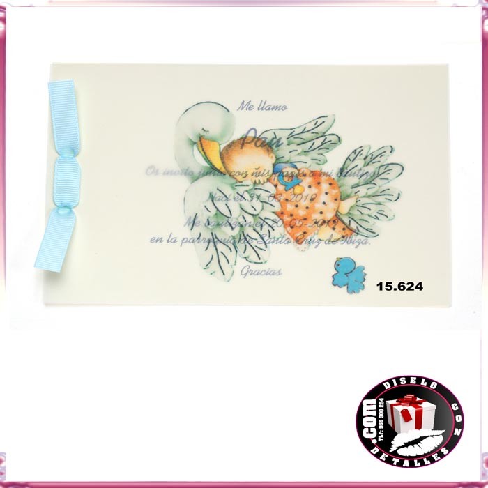 Original convite de batismo de um menino com un desenho de um cisne e bebê com chupeta azul.