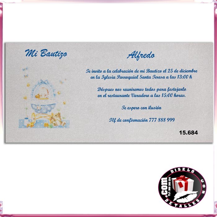 Convite de batismo de um menino com desenho de un carrinho de criança en cores azuis.