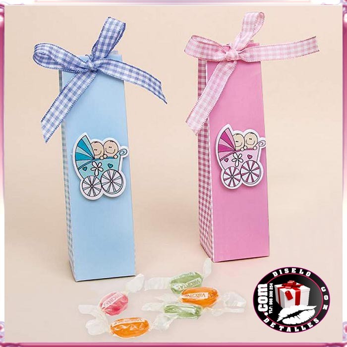 Pequenas caixas de cartão decoradas com laços e adesivo com bebê em cores azuis o rosas a escolher.