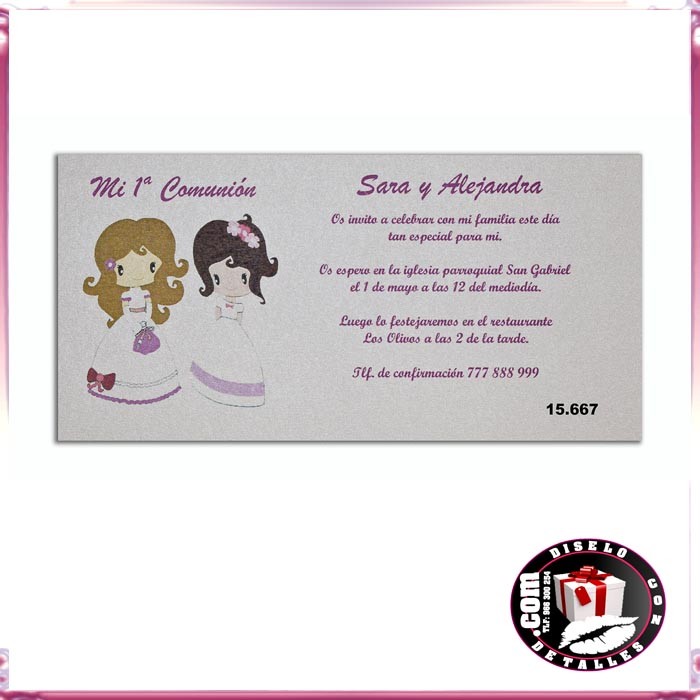 Convite de Comunhão com desenho de um par de meninas de comunhão feito com papel grosso de 300grs nacarado pelas duas caras. Especial para convites.