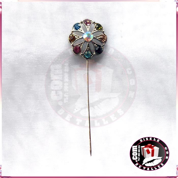Alfinetes ou agulhas com uma flor com brilhos às cores para presentes de casamento.