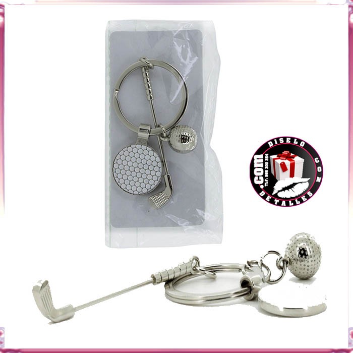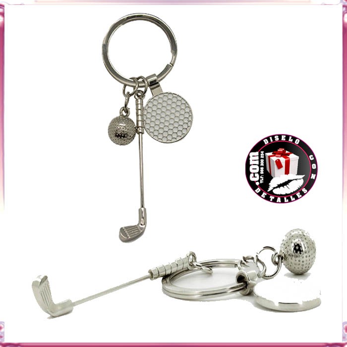 Chaveiro em forma de vara de golfe com medalha em forma de bola e bola esférica de golfe, tudo de metal brilho ideal para gravação Laser e ser ofrecidos como obsequio publicitario ou detalhe do evento.