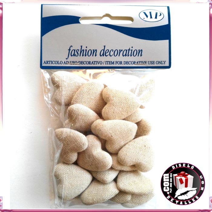 Corações adesivos forrados com serapilheira o pano de saco, ideal para decorar pequenos detalhes.