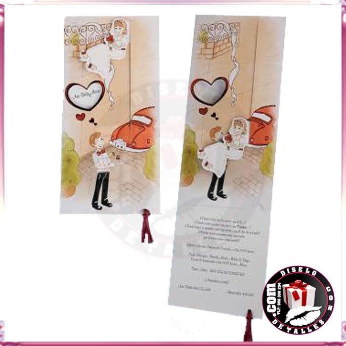 Convite ou cartões de casamento original e divertido. Puxando a ráfia para baixo a noiva salta para os braços do noivo.