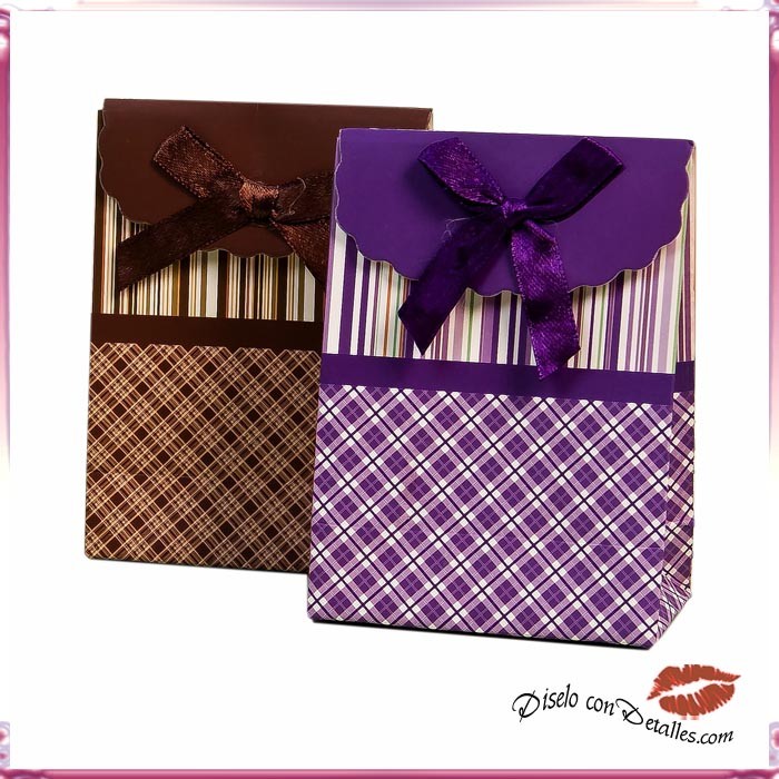 Caixas decoradas às riscas e laço de cetim em cores sortidas.